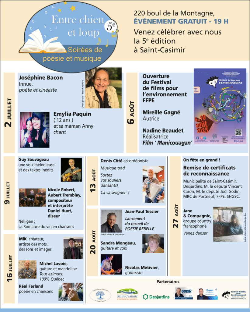 La poésie fait partie de l’ADN de Saint-Casimir et de la région de Portneuf. La Fondation du patrimoine de Saint-Casimir appuyée de Rendez-vous culturels de Saint-Casimir et de la Société d’histoire et de généalogie de Saint-Casimir a créé les mercredis de poésie sous la dénomination de Entre chien et loup